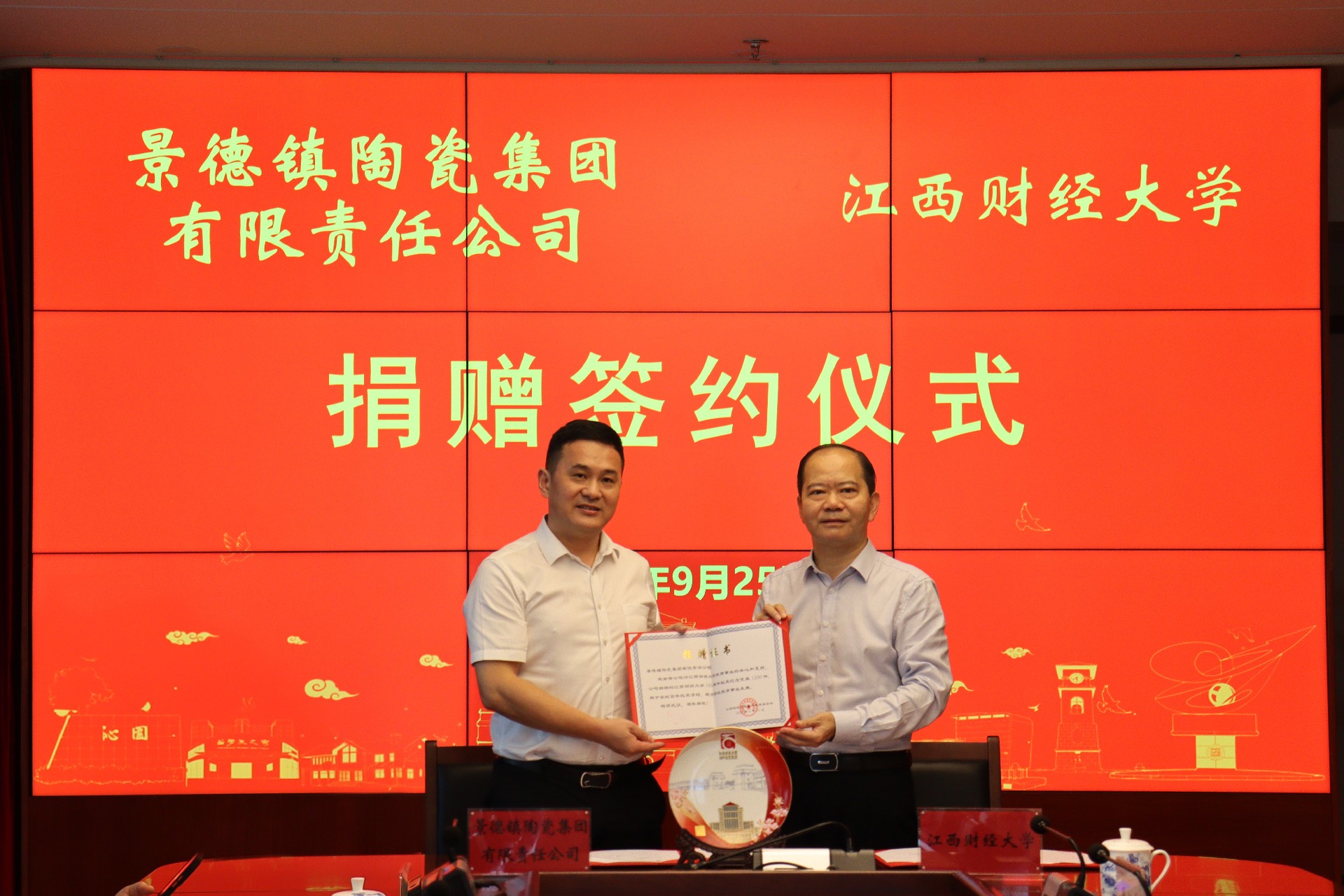 簽約儀式上,吳愛云代表景陶集團與江西財經(jīng)大學簽署捐贈協(xié)議,并捐贈紀念瓷盤,鄧景揚代表景陶集團接受江西財大頒發(fā)的《捐贈證書》。