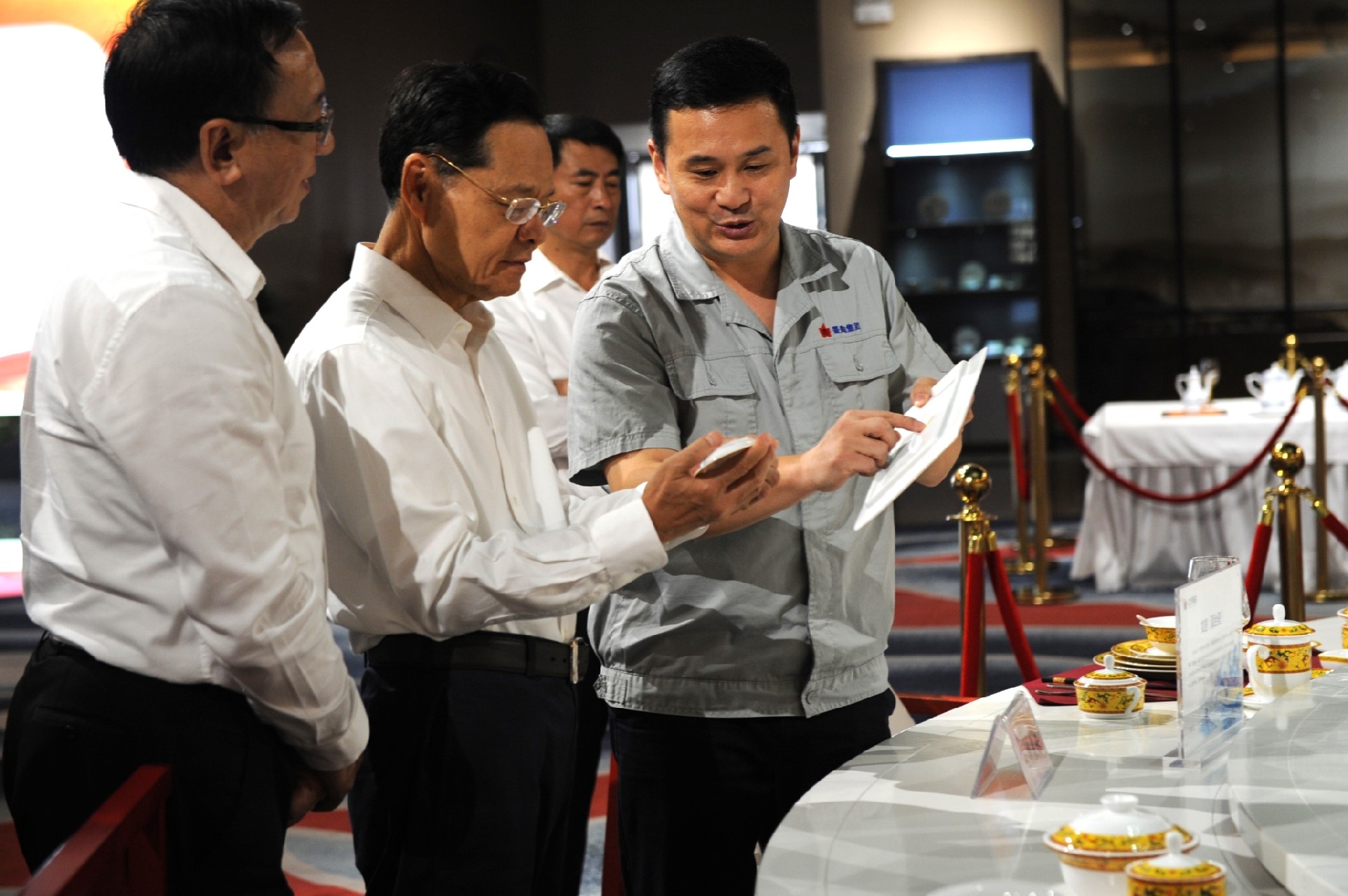 走進(jìn)國(guó)瓷館,鄧景揚(yáng)向陳武一行介紹了集團(tuán)的基本情況,國(guó)瓷館展廳規(guī)模。鄧景揚(yáng)介紹說(shuō),“國(guó)瓷館”是目前全世界最大的單一品牌陶瓷展廳。參觀時(shí),陳武興致勃勃地拿起桌上的一套產(chǎn)品仔細(xì)端詳,鄧景揚(yáng)適時(shí)介紹到:“這是我們新開(kāi)發(fā)的一款產(chǎn)品,是一套組合餐具,該產(chǎn)品將日用陶瓷和藝術(shù)陶瓷巧妙結(jié)合,合起來(lái)是一個(gè)花瓶的造型?!薄斑@個(gè)不錯(cuò),有創(chuàng)意!是紅葉品牌嗎?”陳武問(wèn)道?!斑@是我們集團(tuán)旗下一個(gè)“百花”品牌的產(chǎn)品?!彪S即,鄧景揚(yáng)向陳武介紹了景陶集團(tuán)發(fā)展脈絡(luò)和以“國(guó)瓷紅葉”為主打品牌,金品陶、百花、家好系統(tǒng)品牌特色,集聚綻放的特點(diǎn)。期間,鄧景揚(yáng)講述了“紅葉”與“御窯”前世今生的關(guān)系和如何將“紅葉”產(chǎn)業(yè)和陶瓷文化進(jìn)一步做大做強(qiáng)制定的新的發(fā)展愿景。鄧景揚(yáng)介紹道,“我們集團(tuán)的發(fā)展愿景是做世界上最精美的瓷器,創(chuàng)百年一流企業(yè),讓‘紅葉’成為世界知名的日用陶瓷中國(guó)民族品牌,用陶瓷講好中國(guó)故事,展中華文化風(fēng)采,讓‘紅葉’成為中華文化走向世界的文明使者?!标愇渎?tīng)后表示十分認(rèn)可和贊同,并勉勵(lì)景陶集團(tuán)進(jìn)一步發(fā)揮好景德鎮(zhèn)陶瓷龍頭企業(yè)的帶頭作用,讓紅葉陶瓷真正走出去。