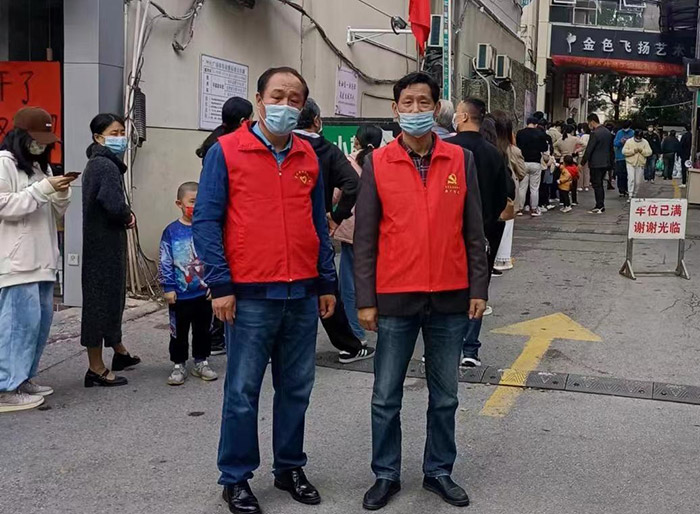 副書記陳華、黨員劉志華居住在高風(fēng)險(xiǎn)小區(qū)內(nèi),但是他們無懼風(fēng)險(xiǎn),主動請纓,負(fù)責(zé)值守被封控的樓棟,確保疫情阻斷在網(wǎng)格內(nèi)。