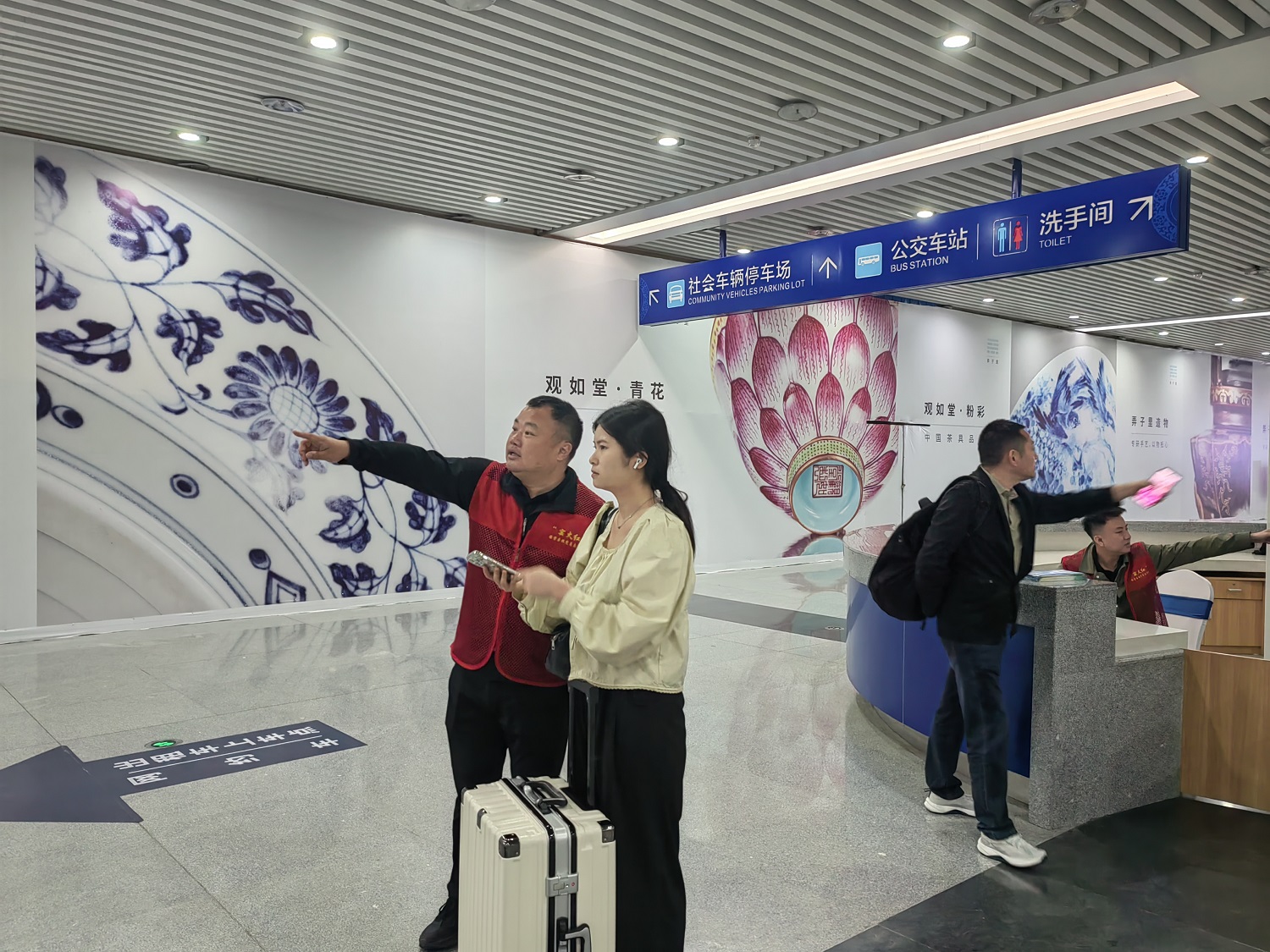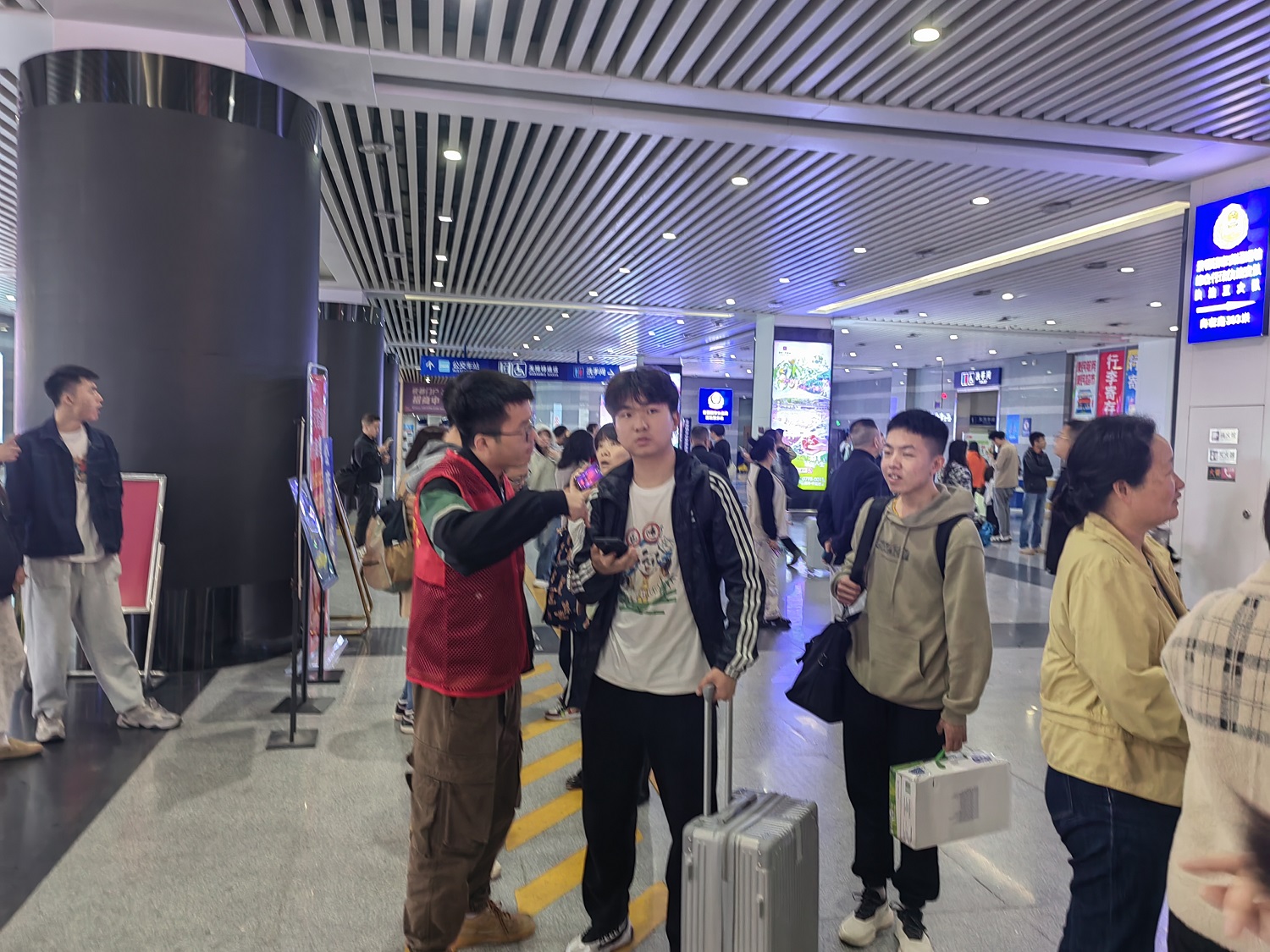在各服務站點,志愿者們一會兒化身導游,一會兒化身美食家,一會兒化身行李俠……為旅客提供周到的服務,旅客們紛紛點贊志愿者們熱心、舒心、暖心!
