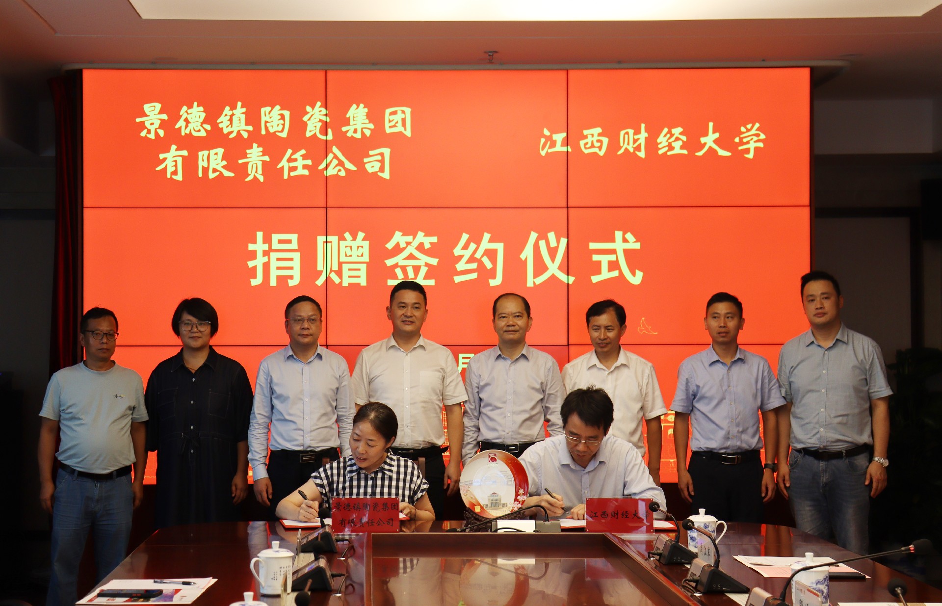簽約儀式上,吳愛云代表景陶集團與江西財經(jīng)大學簽署捐贈協(xié)議,并捐贈紀念瓷盤,鄧景揚代表景陶集團接受江西財大頒發(fā)的《捐贈證書》。